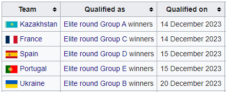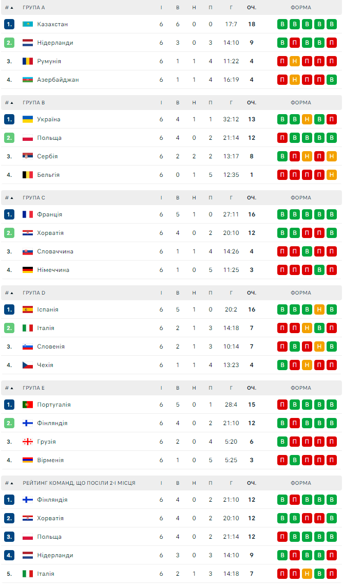 Забезпечили собі перепустку на ЧС-2024 5 команд, які виграли групи: Україна, Казахстан, Франція, Іспанія, Португалія.