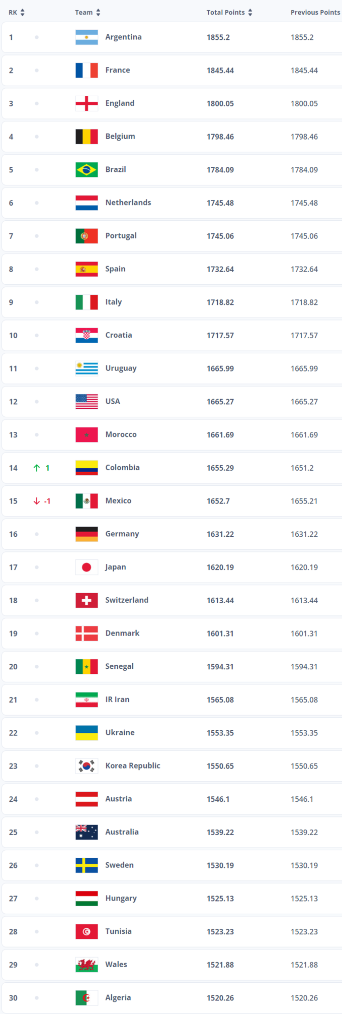 ФІФА оновила рейтинг національних збірних, в якому Україна перебуває на 22-му місці.
