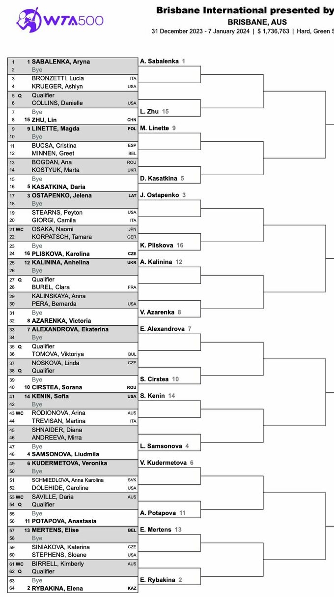 Main draw in Brisbane (WTA 500), where Aryna Sabalenka and Elena Rybakina are the top seeds.
