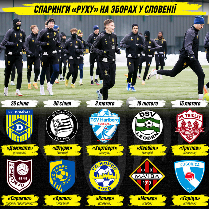 Львівський «Рух» назвав усіх спаринг-суперників по навчально-тренувальних зборах у Словенії, де команда буде знаходитися з 20 січня.