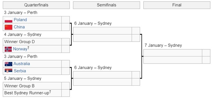 Збірна Норвегії очікує на найкращу команду групи D, ще в одній парі зіграють найкраща команда групи B і найкраща друга команда з тих, що грали в Сіднеї (групи B, D або Хорватія).