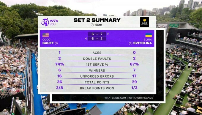 Big flex 💪@ElinaSvitolina snaps Gauff's consecutive set streak in Auckland at 18 after she claims the first 7-6(4) in the title match.#ASBClassic pic.twitter.com/Z5mS5illLi