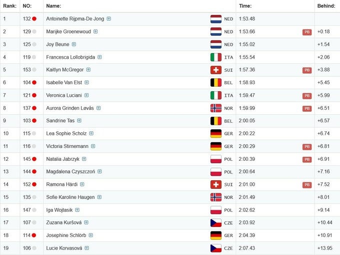 Райпма-Де Йонг бігла в передостанній парі зі своєю співвітчизницею Мерайке Хруневауд, яку на фініші випередила на 0.18 секунди. Замкнула призову трійку третя нідерландська спортсменка Джой Бьойне, яка поступилася часу чемпіонки трохи більше, ніж півтори секунди.