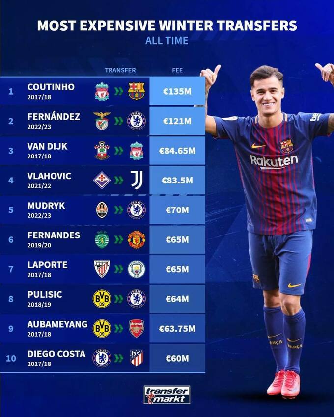 Найдорожчим зимовим трансфером вважається перехід Філіппе Коутіньо з Ліверпуля до Барселони за 135 млн євро (сезон 2017/18).