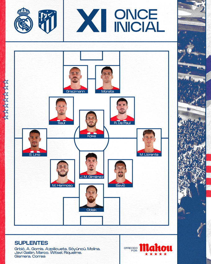 «Атлетіко»: Облак, Ермосо, Хіменес, Савіч, Ліно (Моліна, 67), Льоренте (Аспілікуета, 106), Сауль (Рікельме, 67), Коке (Хаві Галан, 104), Де Пауль (Вітцель, 90), Грізман, Мората (Корреа, 91).