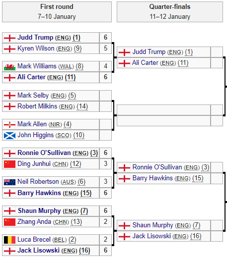 - 08.01. Марк Вільямс (Уельс) – Алі Картер (Англія) – 4:6