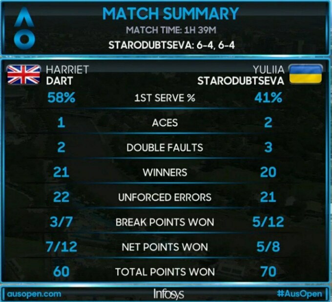 У 2-му раунді кваліфікації українка у двох сетах обіграла Геррієт Дарт (Велика Британія, WTA 114) за 1 годину та 39 хвилин.