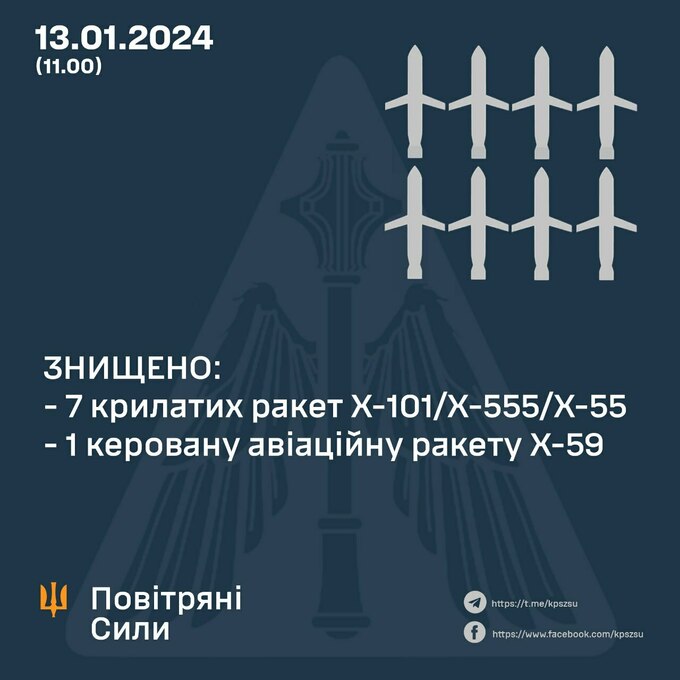 Сили ППО збили 7 крилатих ракет та одну керовану бомбу. Повітряні сили зазначили, що низка інших ракет не була збита, але не досягла своєї мети через активну роботу української РЕБ.