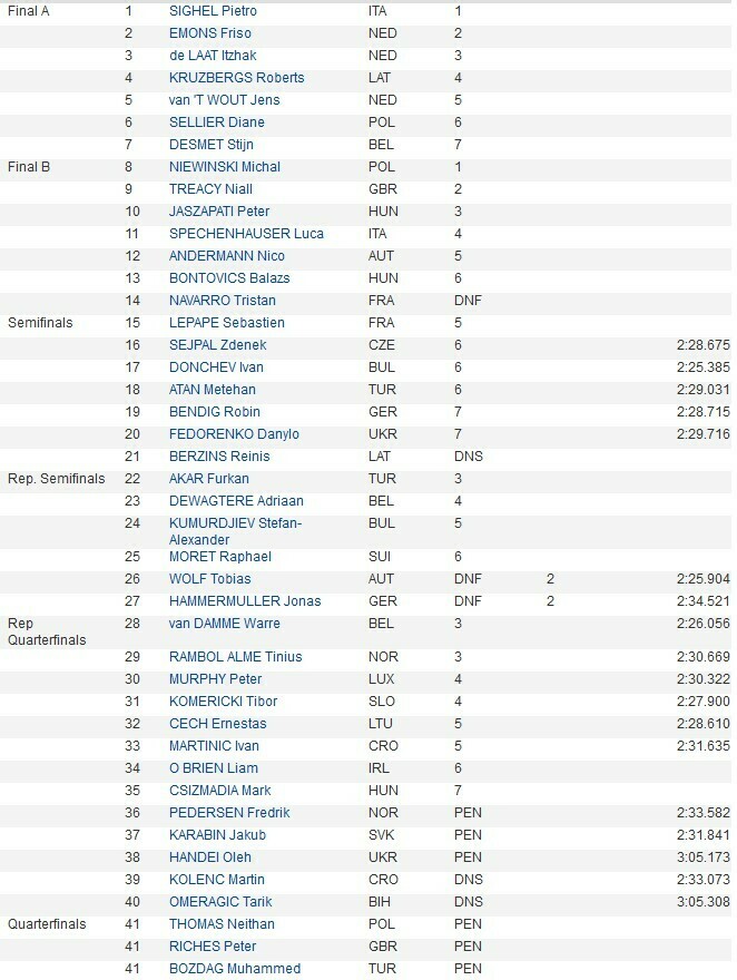 Фінальний забіг завершився падінням латиша Робертса Крузбергса, який довго утримував Сігеля за собою, але на останньому колі італієць його обійшов. В результаті Крузбергс опинився за межами призової трійки, до якої увійшли нідерландці Фрісо Емонс та Ітцхак де Лат.