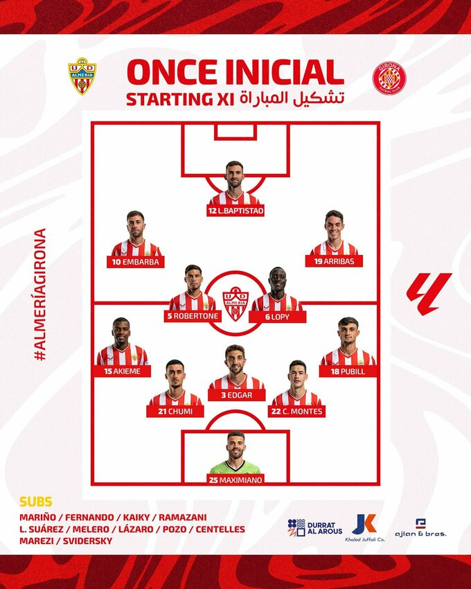 «Альмерія»: Машиміану – Акьєме, Чумі, Едгар (Посо, 63), Монтес (Суарес, 83), Пубіль (Рамазані, 68) – Ембарба (Мелеро, 68), Робертоне, Лопі, Аррібас (Кайкі, 84) – Баптістао.