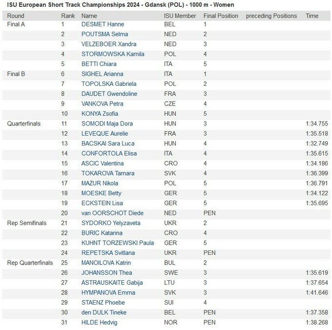 Бельгійка Ханна Десмет успішно захистила титул чемпіонки Європи на дистанції 1000 метрів на чемпіонат Європи 2024 року у польському Гданську.