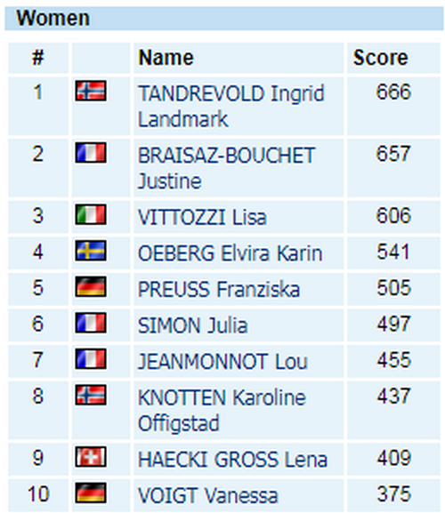 Жюстін Бреза-Буше з чотирма промахами посіла 7-ме місце і втратила першу позицію у загальному заліку Кубка світу. На 9 очок її випередила Тандреволд. Ліза Віттоцці – вже третя.