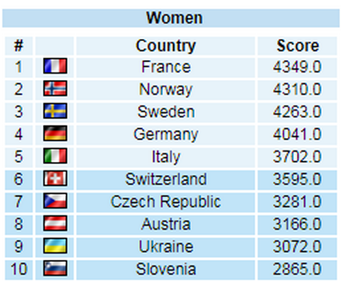 Результати гонки серйозно загострили боротьбу серед лідерів у Кубку націй. Франція продовжує лідирувати, але Норвегія так само поруч. А до самих норвежок почали підбиратися шведки.