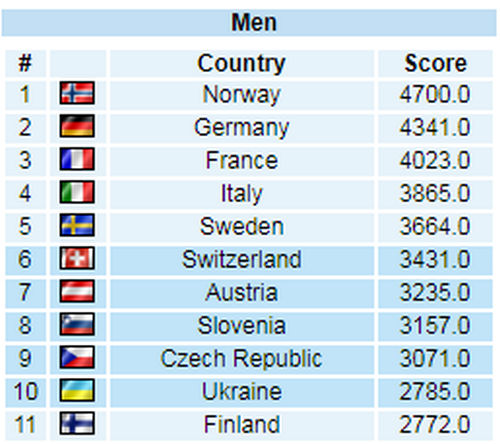 У Кубку націй величезні відриви одна від одної мають збірні Норвегії, Німеччини та Франції. Єдиною цікавинкою стало те, що італійці на одне очко обішли шведів після невдалого спринту (жодної людини у топ-20!) у виконанні скандинавів.