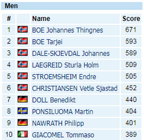 У загальному заліку Кубка світу перші позиції посідають вже не п’ятеро норвежців, а шестеро. До п’яти партнерів по команді після блискучого етапу доєднався Крістіансен. Бьо-молодший випереджає Бьо-старшого на комфортну відстань, а у спину Тар’єю вже дихає Йоганнес Дале.