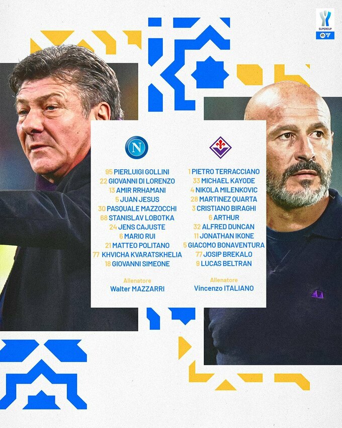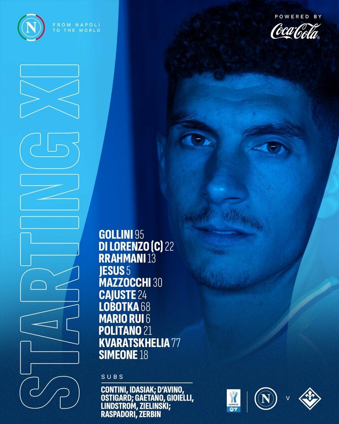 «Наполі»: Голліні – Жезус, Ррахмані, Ді Лоренцо – Руї (Естігор, 72), Лоботка, Каюсте (Гаетано, 77), Маццоккі (Дзербін, 81) – Кварацхелія (Зелінські, 72), Сімеоне, Політано (Ліндстрьом, 72).