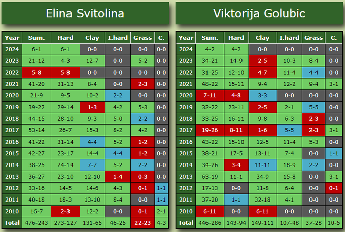 Статистика виграних /програних матчів Світоліної та Голубич за роками