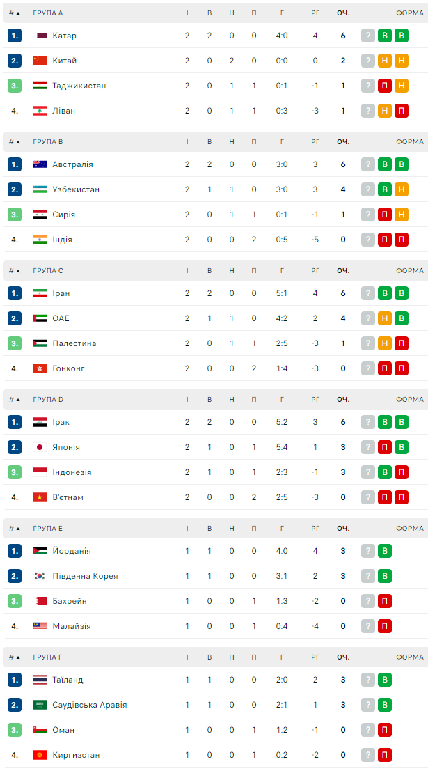Турнірні таблиці Кубка Азії. Гонконг мінімально програв Ірану