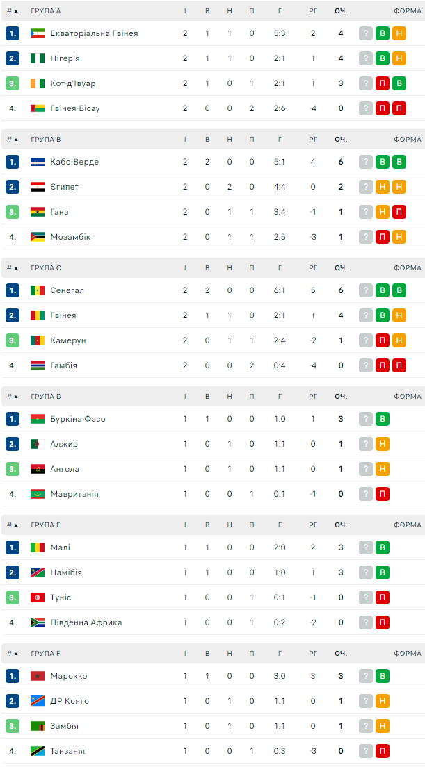 До 1/8 фіналу Кубка африканських націй вже вийшли дві збірні: Кабо-Верде та Сенегал, які здобули по дві перемоги.