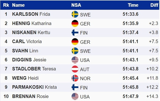 У вчорашньому спринті в Оберхофі Карлссон стала другою, перемогу здобула її партнерка по команді Лінн Сван, яка сьогодні фінішувала п'ятою.