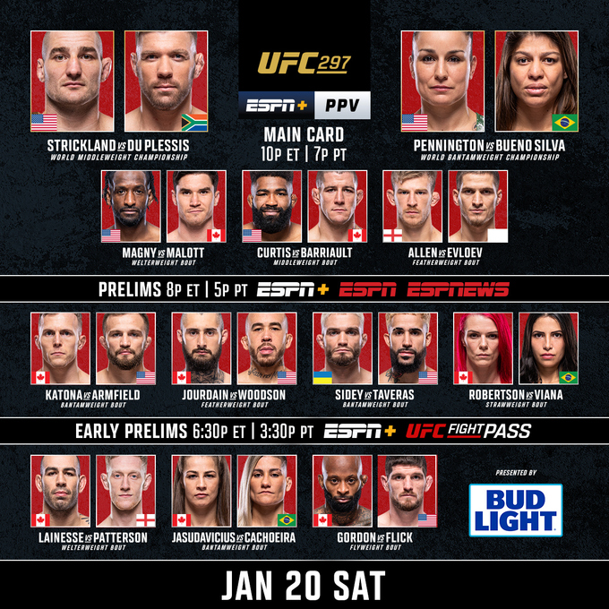 Турнір зі змішаних єдиноборств UFC 297 проходить у ніч з 20 на 21 січня у канадському місті Торонто.