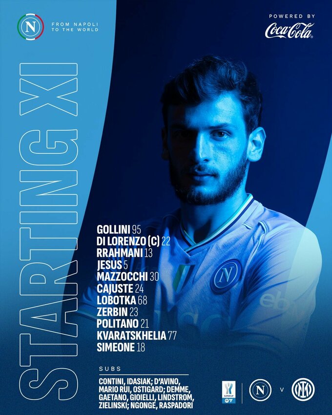 «Наполі»: Голліні – Жезус, Ррахмані, Ді Лоренцо – Дзербін (Естігор, 58), Лоботка, Каюсте (Руї, 75), Маццоккі (Распадорі, 74) – Кварацхелія (Гаетано, 70), Сімеоне, Політано (Ліндстрьом, 70).
