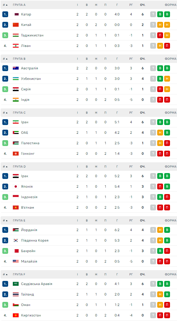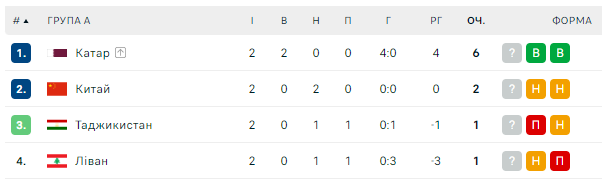 Катар (6 очок) достроково вийшов у плей-оф, далі йдуть: Китай (2), Таджикистан, Ліван (по 1).