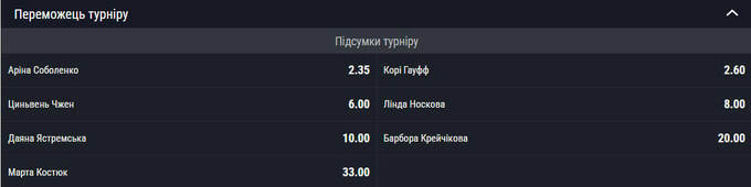 Головною фавориткою австралійського мейджора є друга ракетка світу Аріна Соболенко, яка виступає у «нейтральному» статусі. На її тріумф можна поставити із коефіцієнтом 2.35.
