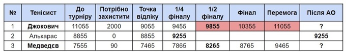 Новак гарантував собі 9855 очок після завершення турніру, у Карлоса буде 9255, Даніїл, якщо виграє титул, набере 9465 очок і стане другою ракеткою світу.