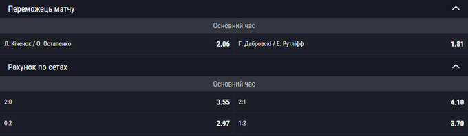 Коефіцієнт на перемогу українсько-латвійського тандему складає 2.06. На те, що Кіченок та Остапенко закриють суперниць у двох сетах – 3.55, у трьох – 4.10.