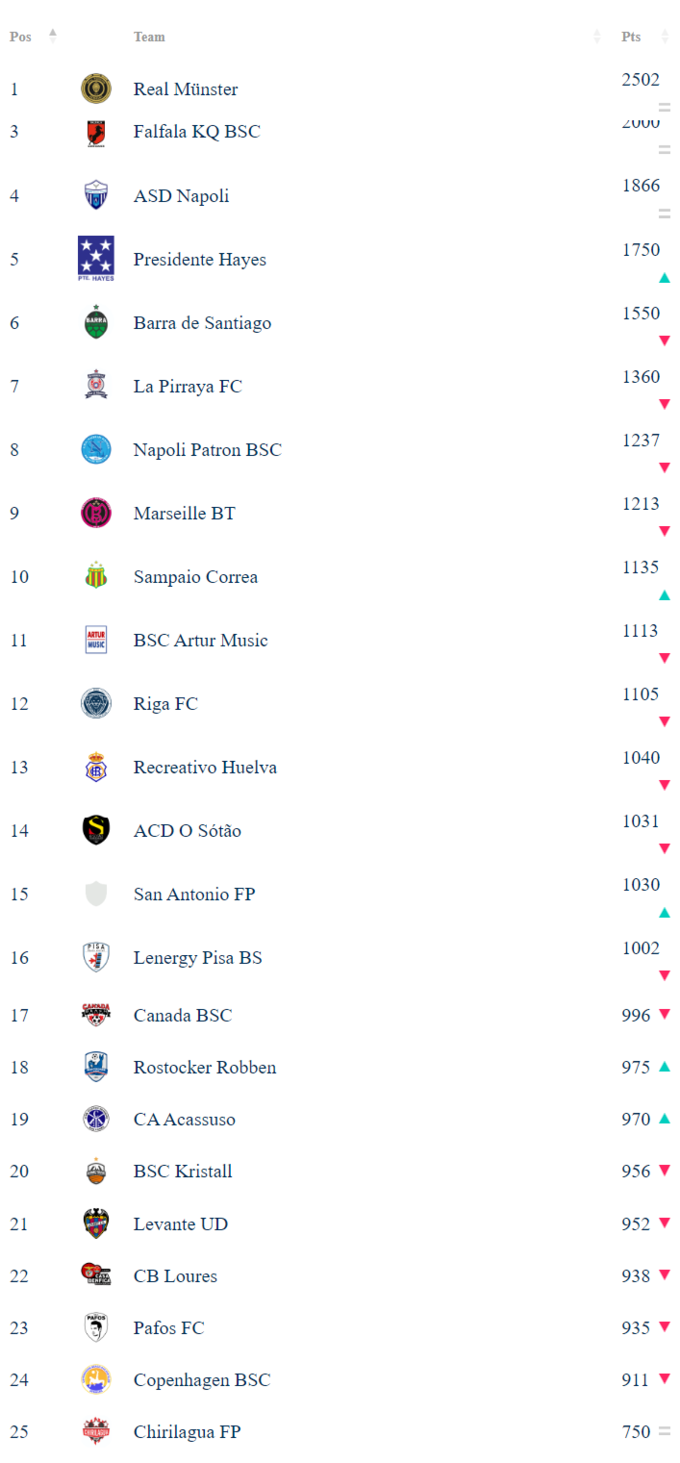 Серед чоловічих українських клубів найвище місце – у київського «Артур М'юзік». Він розташувався на 11-й сходинці із 1113 балами, відстаючи від бразильського Sampaio Correa на 22 пункти. Дніпровський «Вибір» посідає 41-шу позицію, київський «Сервіт» – 148-му, «Гриффін» – 157-му, NC Beachsoccer – 183-тю, «Альтернатива» – 233-тю. Лідер світового рейтингу – німецький Real Munster.