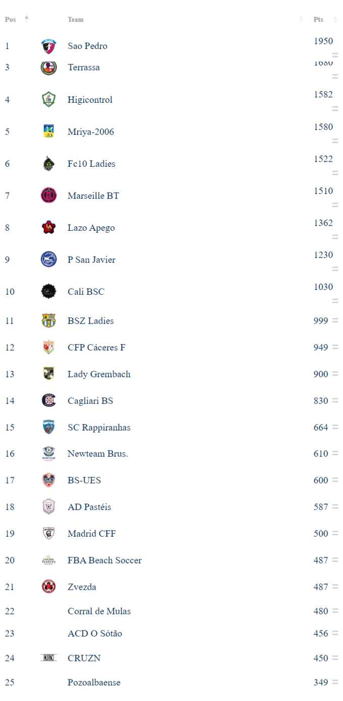 Офіційний сайт BSWW опублікував оновлений рейтинг чоловічих і жіночих клубних команд із пляжного футболу. Серед жіночих українських клубів найвище місце посідає ананьївська «Мрія-2006», яка розташувалася на 5-й сходинці табелю про ранги. Вона має в активі 1580 очок і на 5 пунктів відстає від іспанського Higicontrol. Лідирує бразильський Sao Pedro.