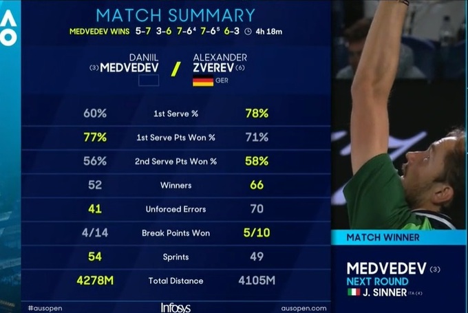 Це був четвертий випадок у кар'єрі Медведєва, коли він зумів відігратися, програвши два перші сети. Ще 15 таких матчів він програв.
