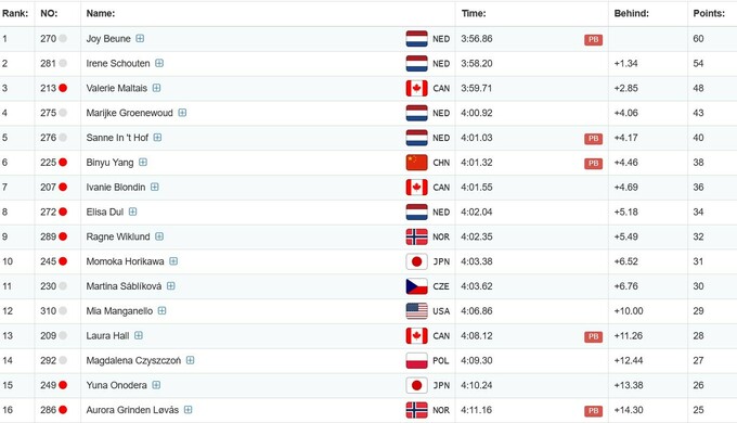 Для 24-річної Бьойне це перша у кар'єрі перемога на етапі Кубка світу. Окрім того, молода нідерландка також встановила особистий рекорд на цій дистанції. Друге місце посіла олімпійська чемпіонка 2022 року і чинна віцечемпіонка світу Ірейне Схаутен, а замкнула призову трійку Валері Мальте з Канади.