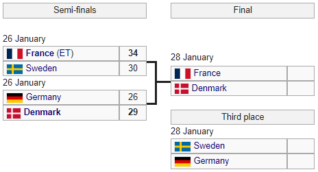 Таким чином, у фіналі 28 січня зустрінуться: Франція – Данія, а третє місце розіграють Швеція – Німеччина.