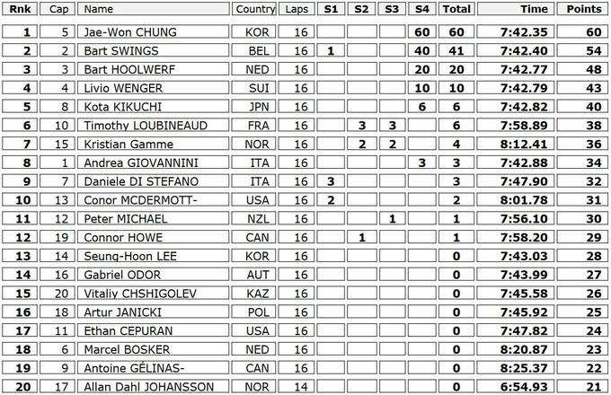 Для 22-річного Чхана ця перемога стала першою у кар'єрі у мас-стартах на етапах Кубка світу. Другим фінішував чинний чемпіон світу та олімпійський чемпіон 2022, бельгієць Барт Свінгс, а замкнув призову трійку чинний віце-чемпіон світу Барт Холверф із Нідерландів.
