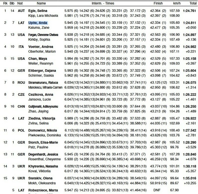 Найкращими з двох українських двійок стали Наталія Хитренко та Вікторія Коваль, які посіли 14-те місце з відставанням від Егле та Кіпп у 5.357 секунди. Олена Стецків та Олександра Мох показали 15-й час.