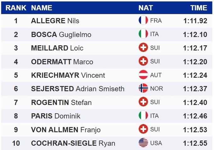 Аллегр випередив італійця Гульєльмо Боску і швейцарця Лоїка Мейяра.