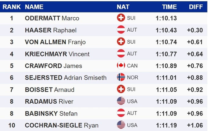 Швейцарський гірськолижник Марко Одерматт виграв другий супергігант на етапі Кубка світу в німецькому Гарміш-Партенкірхені. Він випередив австрійця Рафаеля Хазера і партнера по команді Франьо Фон Алльмена.