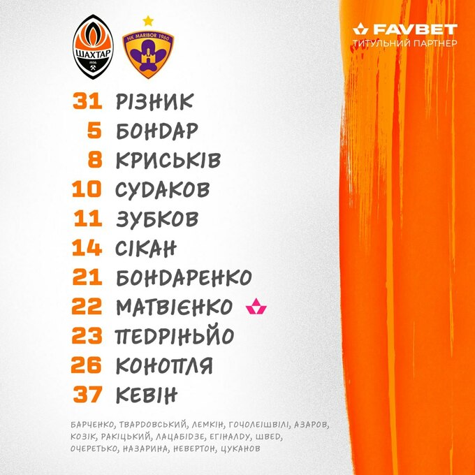Стартовий склад «Шахтаря»: Різник, Конопля, Бондар, Матвієнко, Педріньйо, Криськів, Бондаренко, Судаков, Зубков, Кевін, Сікан.