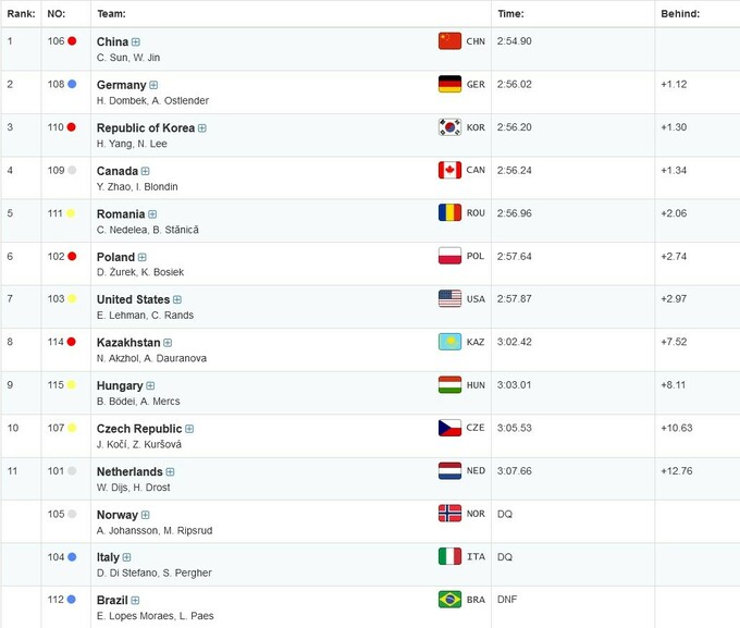 За підсумками змагань китайці обійшли Хендріка Домбека та Анну Остлендер із Німеччини, які посіли друге місце, на 1.12 секунди. Замкнули призову троку Ян Хо Джун та Йї На Хьон із Південної Кореї, які програли китайцям 1.30 секунди.