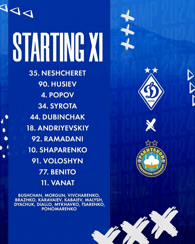 Склад Динамо у другому таймі: Моргун, Нещерет, Михавко, Дячук, Караваєв, Бражко, Малиш, Царенко, Пономаренко, Діалло, Кабаєв.Моргун, Нещерет, Михавко, Дячук, Караваєв, Бражко, Малиш, Царенко, Пономаренко, Діалло, Кабаєв.