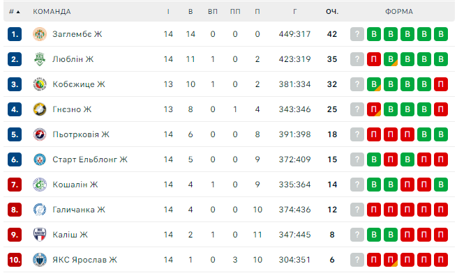 Галичанка посідає 8-е місце серед 10 команд, маючи 12 очок (4 перемоги та 10 поразок).