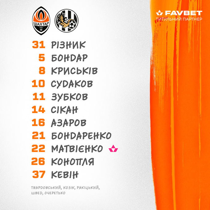 Запасні: Твардовський, Козік, Ракіцький, Швед, Очеретько.