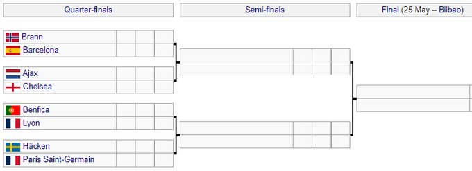 Чвертьфінали: Аякс – Челсі, Бенфіка – Ліон, Хеккен – ПСЖ, Бранн – Барселона