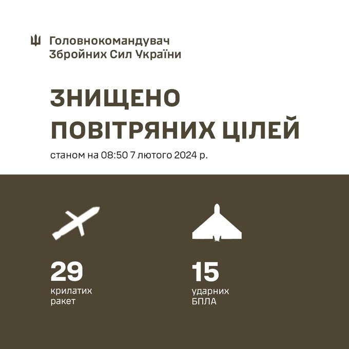 Вночі та вранці 7 лютого російські терористи влаштували чергову масовану ракетну атаку. Повідомляється, що ворог використав близько 11 літаків ТУ-95мс та 6 бортів ТУ-22М3.