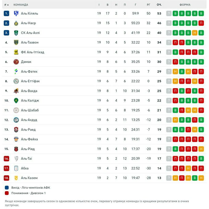 Таблиця чемпіонату Саудівської Аравії після 19 туру