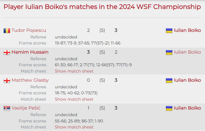 У албанському місті Голем із 3 до 11 лютого 2024 року триває WSF Championship 2024, снукерний чемпіонат світу серед аматорів за версією World Snooker Federation (WSF).
