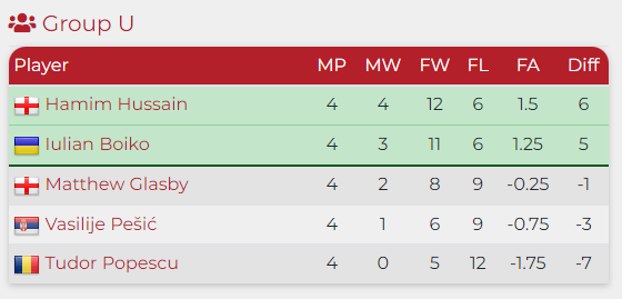 Українці Матвій Лагодзинський, Денис Хмелевський, Артем Суржиков також пробилися у плей-оф. А от Тарас Ульянченко, Михайло Ларков, Петро Сидоренко та Лі Тан не зуміли вийти із групи.