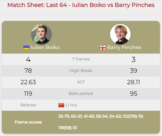 Вранці Бойко у 1/32 фіналу виграв у напруженому матчі у 53-річного ветерана Баррі Пінчеса з Англії (4:3).